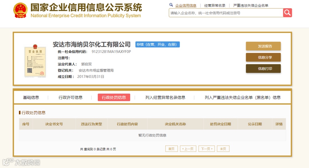 在公示系统中未找到海纳贝尔化工受到行政处罚的信息,在今年相关部门进行的多次抽查中,也未发现相关问题。