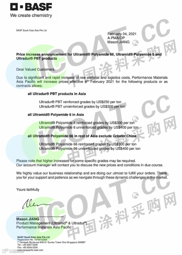 巴斯夫发布涨价函,由于原材料和物流成本快速增长,现将在亚太地区进行如下产品相关价格上涨: