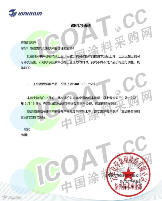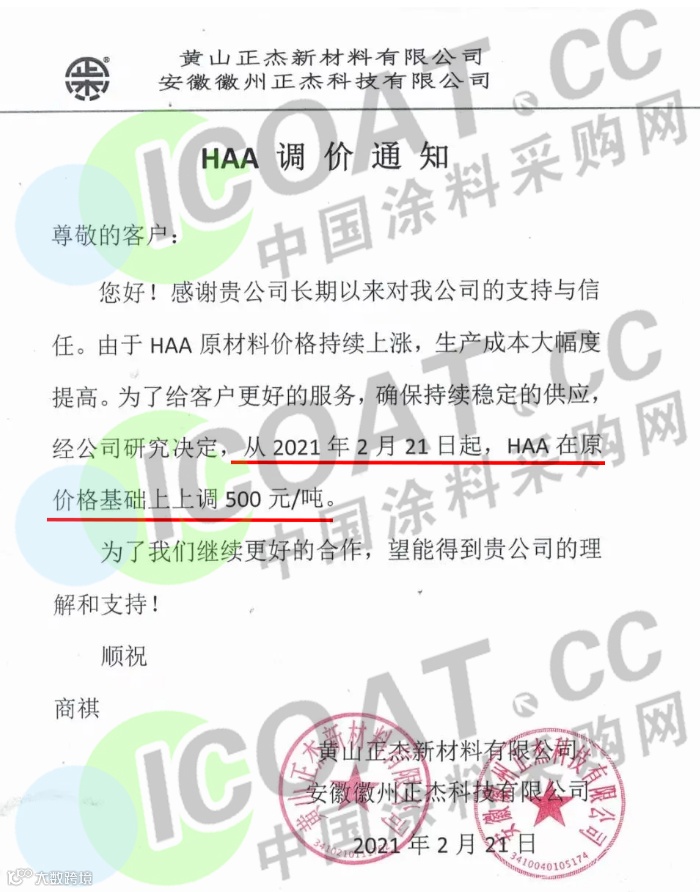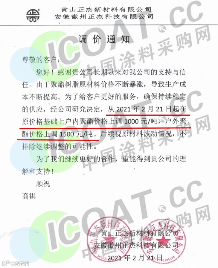 昨日(21日),黄山正杰新材料、安徽徽州正杰科技联合发函,称由于原材料价格不断暴涨,导致生产成本不断提高,经研究决定,从2月21日起,在原价格基础上户内聚酯树脂价格上调1000元/吨,HAA在原价格基础上上调500元/吨。