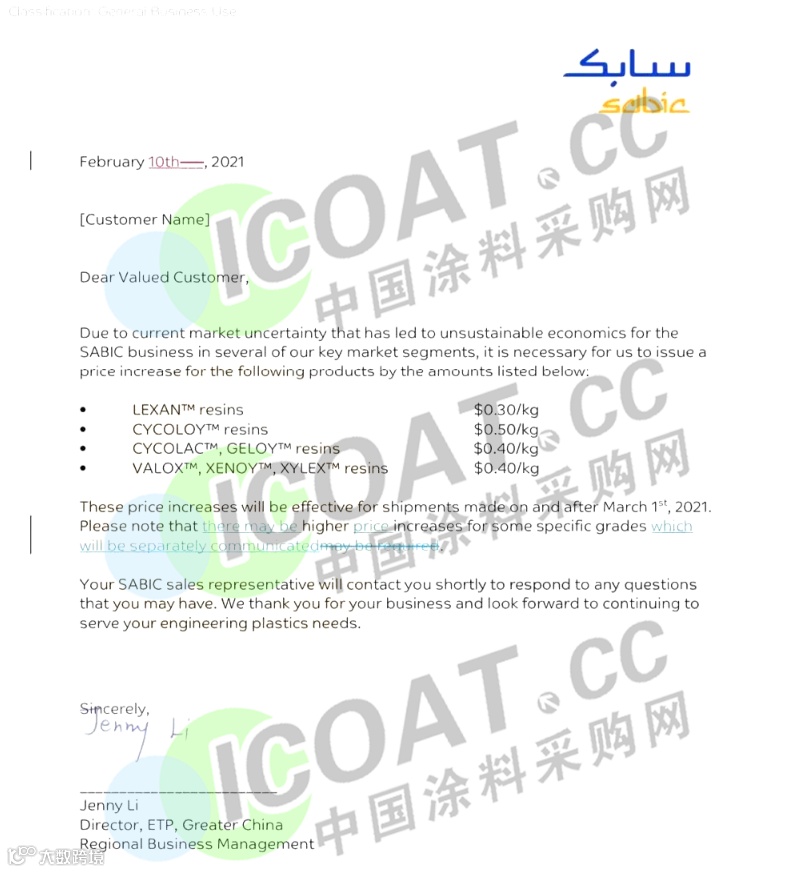 SABIC宣布PC、PC/ABS、ASA、ABS、PBT、PBT/PC、PET/PC涨价300~500美元/吨不等。