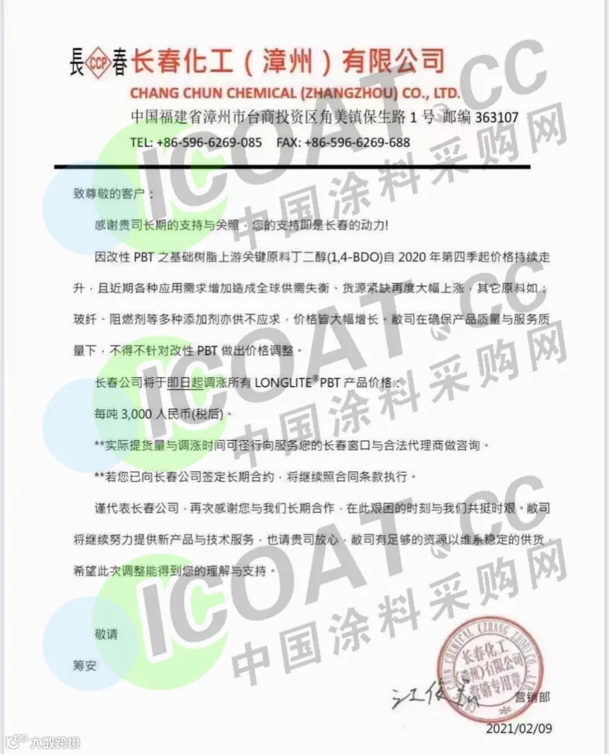 长春化工(漳州)有限公司发函,称因改性PBT基础树脂上游关键原料正丁醇自2020年第四季度起价格持续走升,且近期各种应用需求增加造成全球供需失衡、货源紧缺再度大幅调涨,即日起调涨所有LONGLITE PBT产品价格,上涨3000元/吨。