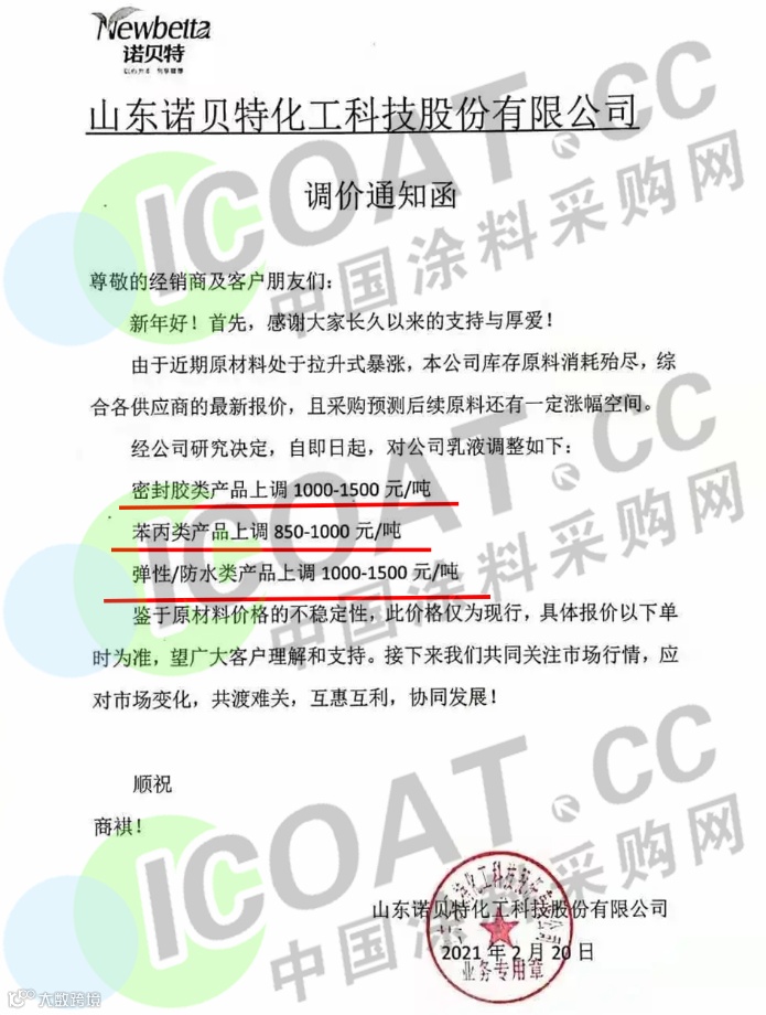 山东诺贝特化工科技发函,称即日起,对公司乳液调整如下: