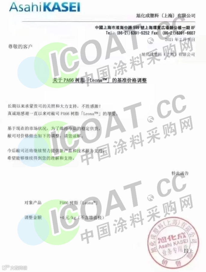 旭化成发函称,由于目前的市场状况,为了保证后续供货的稳定,将上调尼龙66树脂Leona™的价格,上涨4000元/吨。
