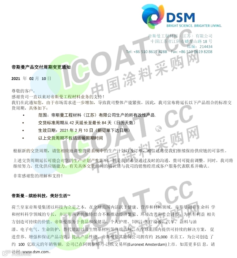 帝斯曼工程材料(江苏)有限公司发函称,所有改性产品交货标准周期从42天延长至84天(日历天数)。生效日期为2月10日(新订单下达日期)。