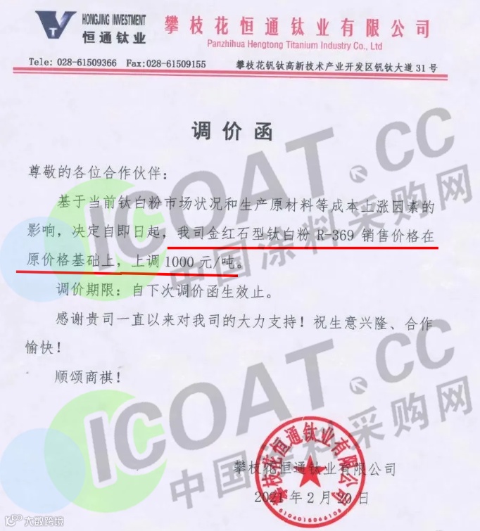 攀枝花恒通钛业发函,称即日起金红石型钛白粉R-369销售价格在原价格基础上上调1000元/吨。这已经是恒通钛业本年度第二次发函宣涨,金红石型钛白粉R-369售价累计上调1500元/吨。