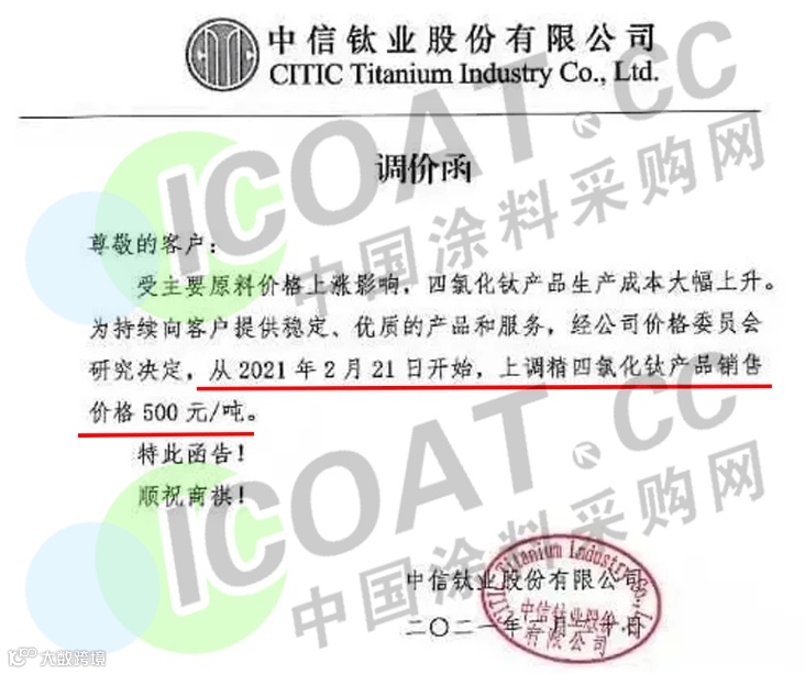 中信钛业发布涨价函,称自2021年2月21日起,上调精四氯化钛产品销售价500元/吨。这也是继1月1日中信钛业调涨CR系列氯化法钛白粉500元/吨之后的再次宣涨。