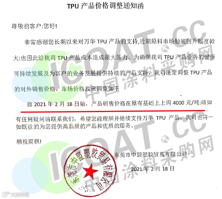 东莞市中盟塑胶发布TPU涨价函,称2月18日起,产品销售价格在原基础上上调4000元/吨。