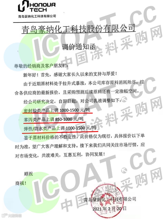 青岛豪纳化工科技发函,称即日起,对公司乳液调整如下: