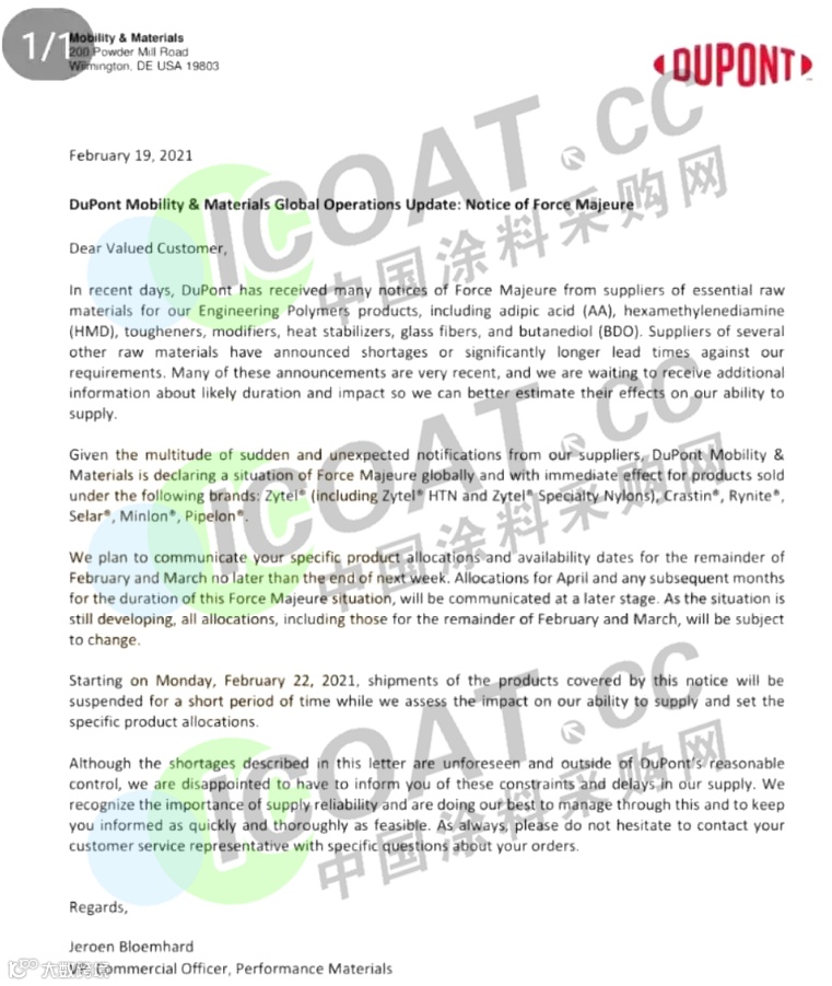 杜邦发函称,鉴于供应商的大量突发和意外通知,杜邦移动与材料公司宣布在全球范围内发生不可抗力情况,并立即影响以下品牌的产品:Zytel“(包括Zytel* HTN和Zytel“特种尼龙),Crastin*,Rynite*,Selar, MinlonR,Pipelon。由于情况仍在发展,所有的拨款,包括2月和3月剩余时间的拨款,将会有所改变。从2021年2月22日(周一)开始,本通知涵盖的产品的发货将暂停一段时间。