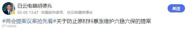 全国政协委员、白云电器董事长胡德兆发布#两会提案议案抢先看#关于防止原材料暴涨维护六稳六保的提案。