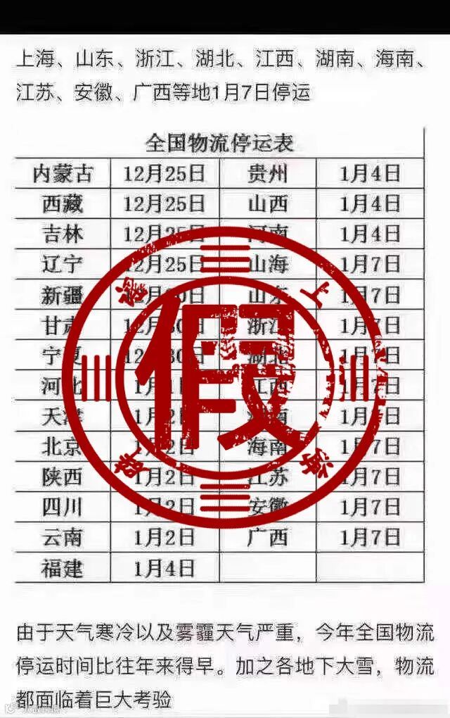 每年1月和12月,“全国物流停运时间表”都会在网上热传,上海辟谣平台曾对相关谣言多次辟谣,今年热传的所谓“时间表”也是根据历年传言拼凑嫁接的,和2021年春节假期完全不符!