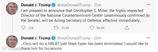 特朗普在推文中说:“我很高兴地宣布,备受尊敬的国家反恐中心主任(参议院一致确认)克里斯托弗·米勒将担任代理国防部长,立即生效,他将担任起伟大的工作。马克·埃斯珀职务已被终止。我感谢他做出的贡献。”