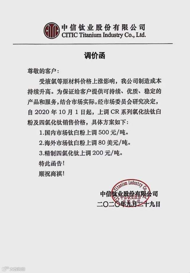9月29日,刚刚完成上市辅导备案的中信钛业发布调价函,其中特别表明:涨价是受液氯等原材料价格上涨影响,公司制造成本持续升高。公司将从10月1日起,上调国内市场钛白粉500元/吨、海外市场钛白粉80美元/吨、精制四氧化钛200元/吨。