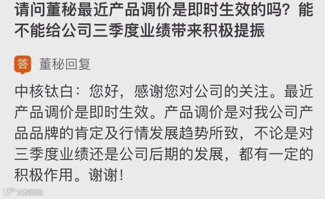 9月27日,中核钛白公告,拟募集资金总额不超过16亿元,扣除发行费用后,募集资金净额将全部用于20万吨/年钛白粉后处理项目和补充流动资金。此前,公司在投资者互动平台上表示,产品调价无论是对三季度业绩还是公司后期的发展都有一定积极作用。