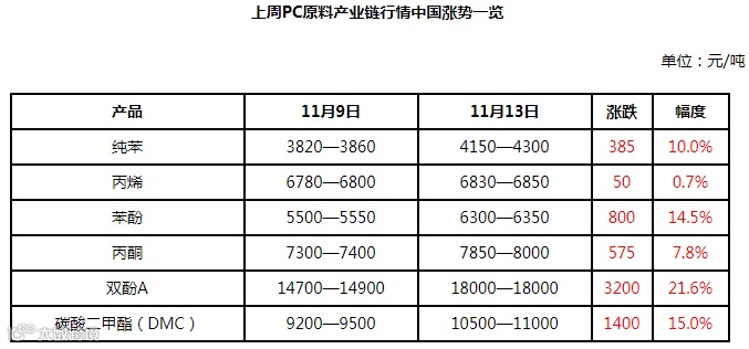 上周PC产业链各产品行情涨幅动态,纯苯、苯酚、双酚A、DMC涨幅均超过10%,PC各工艺主要原料双酚A和DMC涨幅分别高达21.6%和15.0%。上周PC市场各品牌涨幅已达8.9%-16.3%。