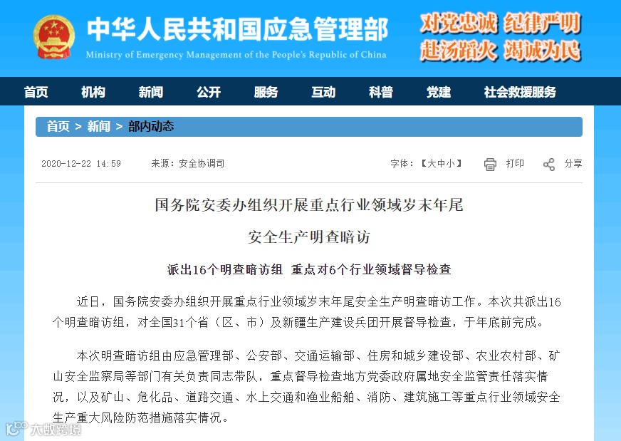 近日,国务院安委办组织开展重点行业领域岁末年尾安全生产明查暗访工作。本次共派出16个明查暗访组,对全国31个省(区、市)及新疆生产建设兵团开展督导检查,于年底前完成。