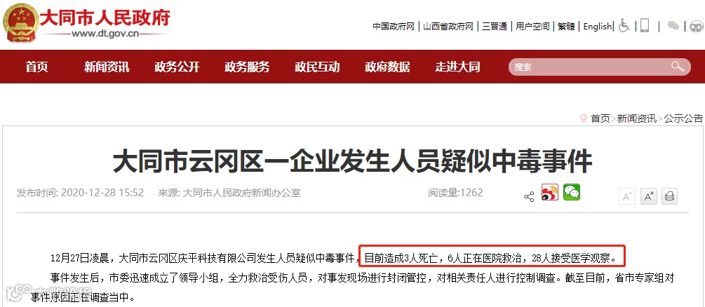 据“大同市人民政府新闻办公室”消息,12月27日凌晨,大同市云冈区庆平科技有限公司(简称庆平科技)发生人员疑似中毒事件,目前造成3人死亡,6人正在医院救治,28人接受医学观察。