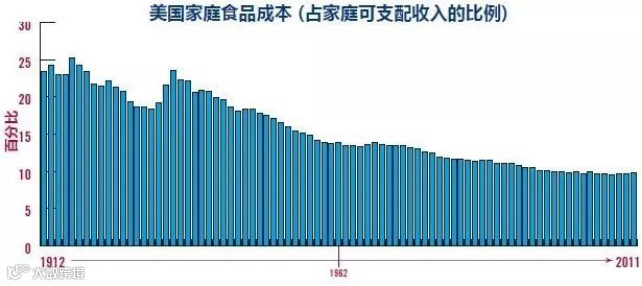 有了这样的背景,美国家庭的恩格尔系数(食品开支占家庭可支配收入的比例)在过去100年稳定下降。这才奠定了大国底气。