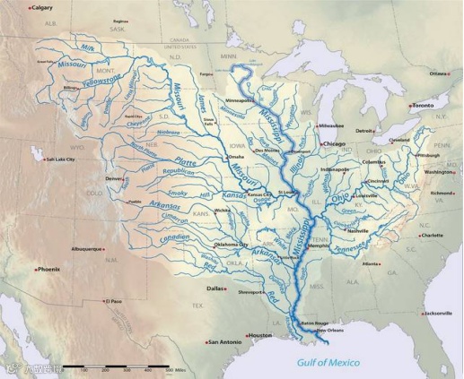 除了一马平川,美国东西两岸沿海。密西西比河与密苏里河两条大河先平行后相交、贯穿南北,加上多条支流以对角的方式横贯东西,美国境内可供航运的河道总长度,比全世界其他国家的总和还要长。