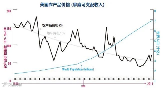 运输便利与自然资源禀赋完美契合,保障了美国农产品的充足供给。去除通胀因素后,美国农产品的实际价格在1900-2011年这111年里,平均每年下降1%。