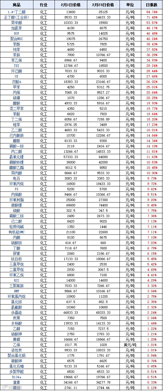 根据市场监测,自2月1日至今,大宗榜共有71个产品上涨,其中18个产品上涨超过20%!涨幅前三位为:1,4-丁二醇(84.74%),正丁醇(71.48%),异辛醇(53.87%)。