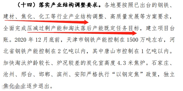 各地要按照已出台的钢铁、 建材、焦化、化工等行业产业结构调整、高质量发展等方案要求, 全面完成压减过剩产能和淘汰落后产能既定任务目标,建立项目台账。石家庄、 沧州、邢台、邯郸、滨州、安阳严格执行“以钢定焦”政策,独立焦化企业逐步退出。