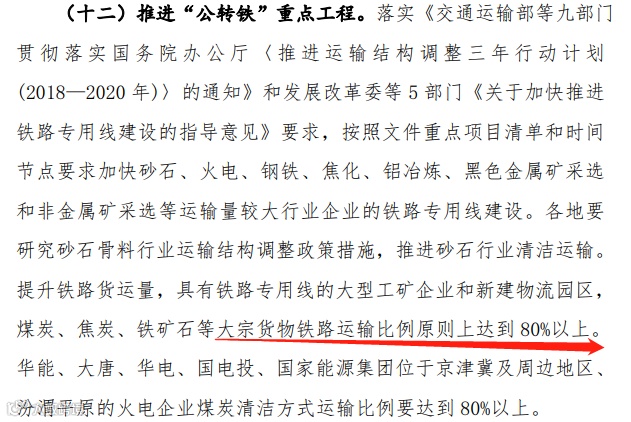 提升铁路货运量,具有铁路专用线的大型工矿企业和新建物流园区, 煤炭、焦炭、铁矿石等大宗货物铁路运输比例原则上达到 80%以上。