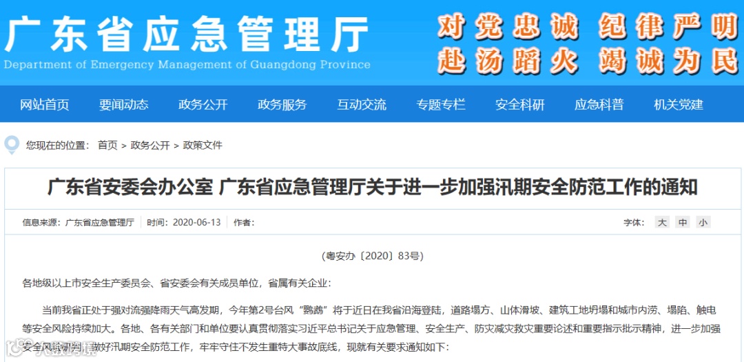 6月13日,广东省安委办、省应急管理厅就进一步加强汛期安全防范工作发出通知,要求严厉打击违法分包转包和不落实危大工程专项施工方案等行为。同时提到要结合实际,严格落实汛期安全防范措施,必要时果断停工、停产、停业、撤人。