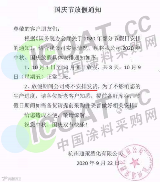 杭州通策塑化有限公司发布通知称,自10月1日至8日放假,放假期间公司不安排发货,为了不影响您的生产进度,请提前备货。