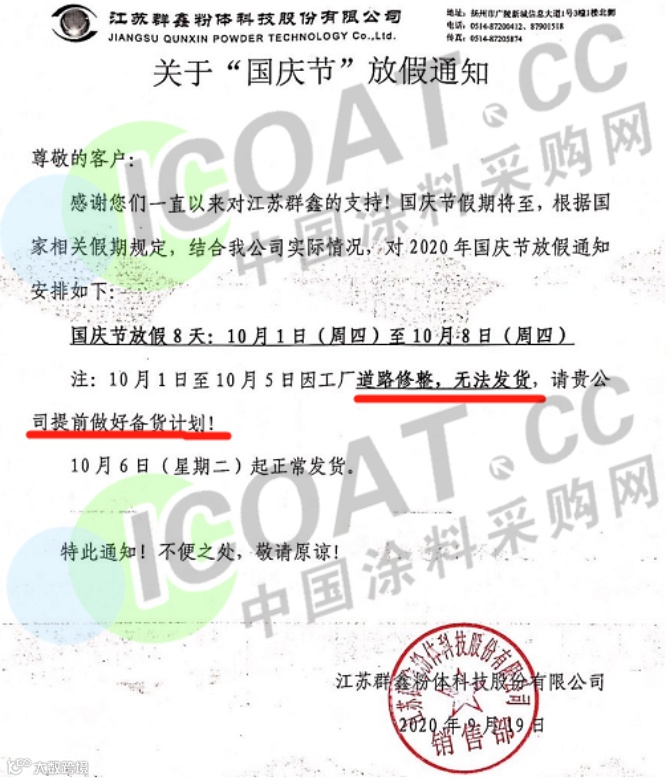 江苏群鑫粉科技股份有限公司发布通知称,自10月1日至5日因工厂道路修整,无法发货,请贵司提前做好备货计划。