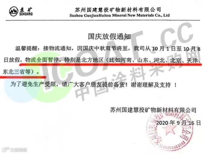苏州国建慧投矿物新材料有限公司发布通知称:自10月1日至8日放假,物流全面暂停,特别是北方地区(比如河南、山东、河北、北京、天津、东北三省等),为避免生产受限,请大家提前备货。
