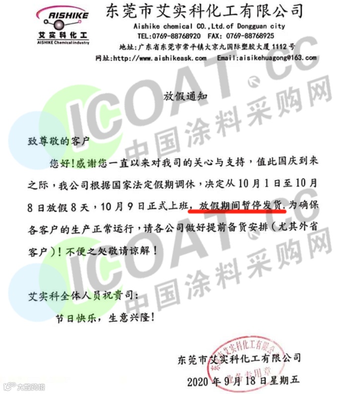 东莞市艾实科化工有限公司发布通知称,自10月1日至8日放假,放假期间暂停发货,为确保各客户的生产正常运行,请提前备货。