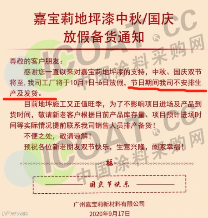 广州嘉宝莉新材料有限公司发布备货通知称:10月1日~6日放假,节日假期我司不安排生产及发货,请大家提前做好备货。