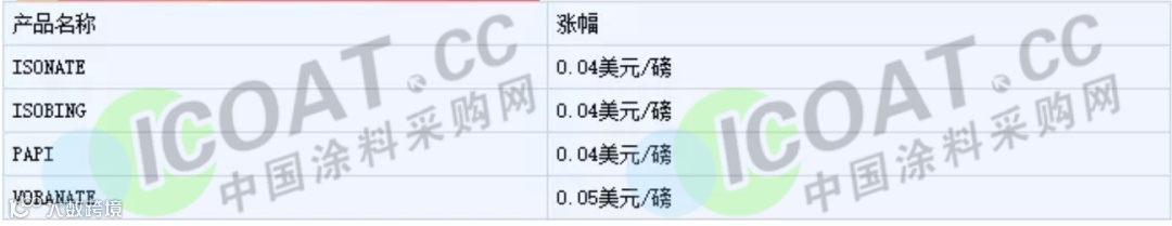 陶氏宣布自2020年10月1日或合同允许时间起,在北美地区提高下列TDI产品所有等级和包装类型的价格: