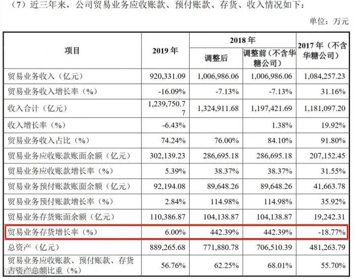 根据公告,2017年-2019年,贸易业务存货增长率为-18.77%、442.39%、6%。21世纪经济报道注意到,近三年该数值变化极大,尤其是2018年,激增了超过400%。