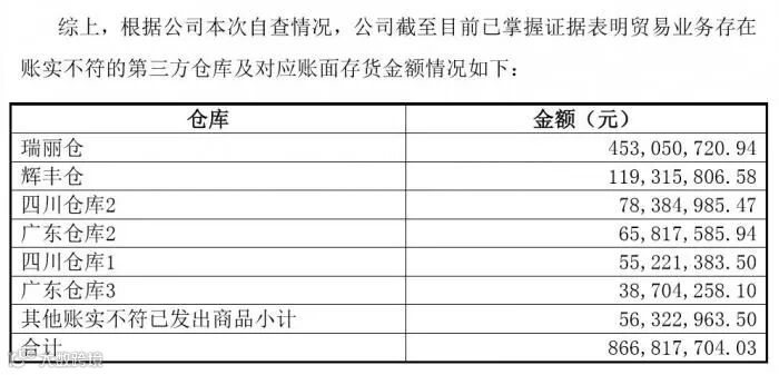 但经过近一个月的核查,广州浪奇在回复深交所关注函的最新公告中表示,公司截至目前已掌握证据表明贸易业务存在账实不符的第三方仓库存货金额及其他账实不符已发出商品金额合计8.6681770403亿元。
