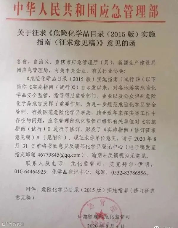 《危险化学品目录(2015版)实施指南(试行)》(以下简称《实施指南(试行)》)自印发以来,对各级应急管理部门落实危险化学品安全监管,指导帮助监管部门、企业以及公众识别危险化学品危害发挥了重要作用。《实施指南(试行)》在实施过程中发现了一些问题,同时社会各界对危险化学品的安全管理提出了更高要求。为更好的做好《危险化学品目录(2015版)》实施,进一步规范危险化学品安全管理,有效防范危险化学品事故,危化监管司组织有关单位对《实施指南(试行)》进行了修订,形成了《实施指南(修订征求意见稿)》(有关材料见附件)。现征求你单位意见,请于2020年8月31日前将书面意见反馈危险化学品登记中心(电子稿发至指定邮箱46779845@qq.com),逾期未反馈视为无意见。
