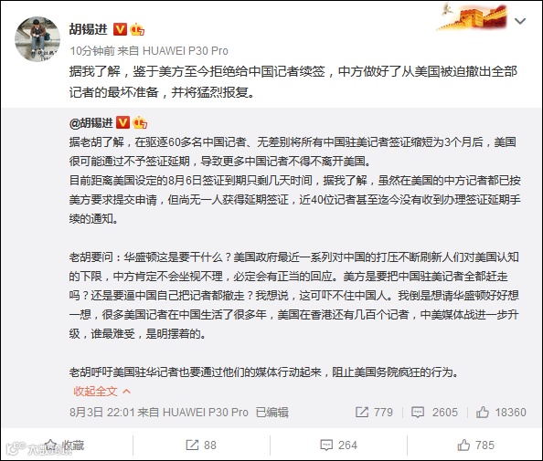 “据老胡了解,在驱逐60多名中国记者、无差别将所有中国驻美记者签证缩短为3个月后,美国很可能通过不予签证延期,导致更多中国记者不得不离开美国。