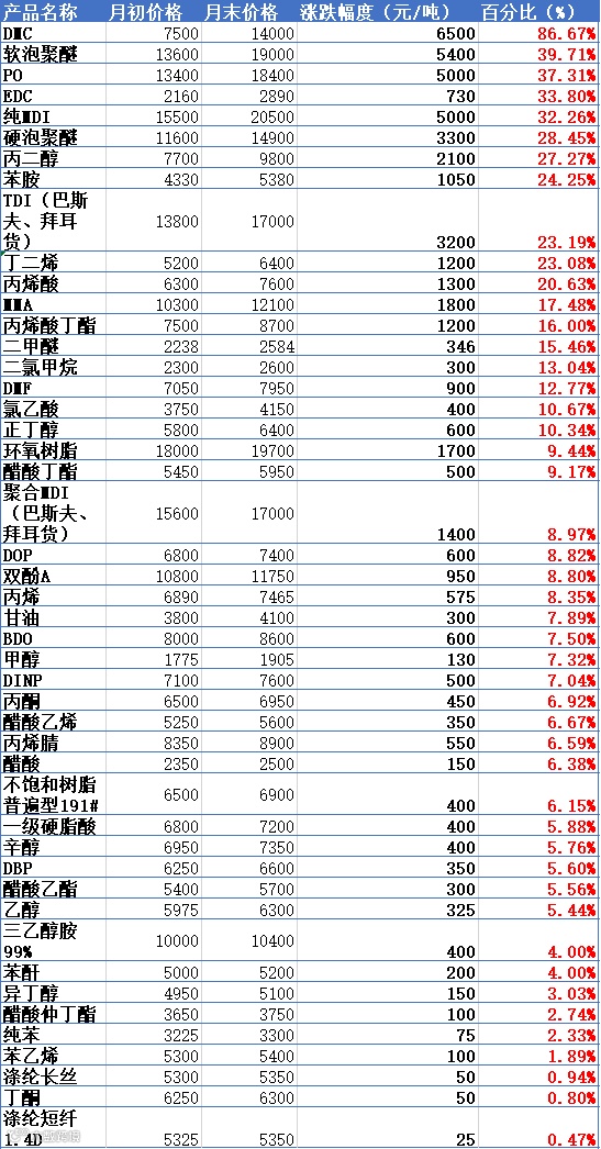 都说九月化工市场出现积极变化,市场信心恢复,涨价一波接一波。那到底有多疯狂呢?口说无凭,让我们用数据说话。