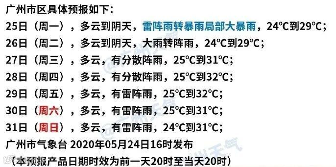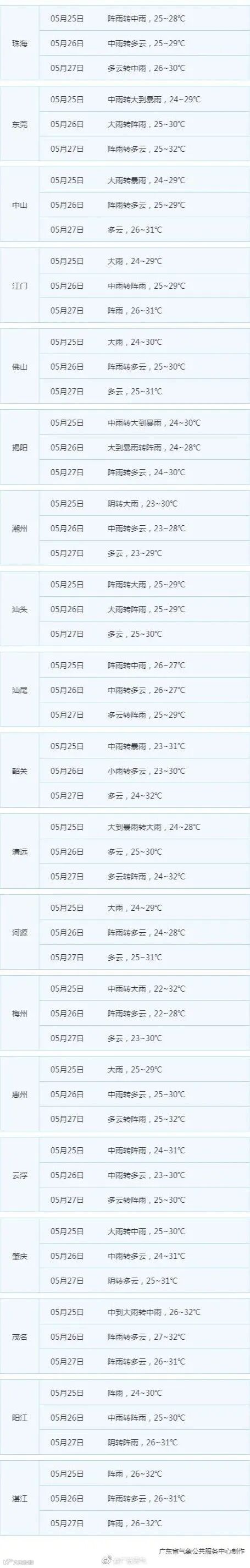 预计,25-26日(周一至周二),粤北市县有暴雨,局部大暴雨,珠江三角洲和粤东市县有大雨到暴雨,粤西市县有中到大雨,局部暴雨;雷雨时部分市县伴有7级~9级的短时大风。