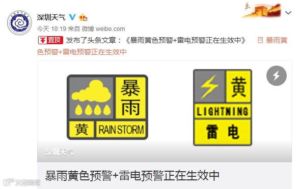 深圳市气象台在全市发布暴雨黄色预警和雷电预警,预计全市2小时内将出现20-40毫米降水,全市进入暴雨戒备状态,请注意防范。