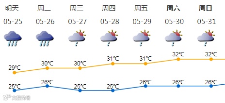 5月25-26日有大雨到暴雨,并伴有雷暴和8级左右短时大风;降雨主要出现在25日中午至26日上午,26日午后降雨减弱;27-28日仍有短时阵雨或雷阵雨。