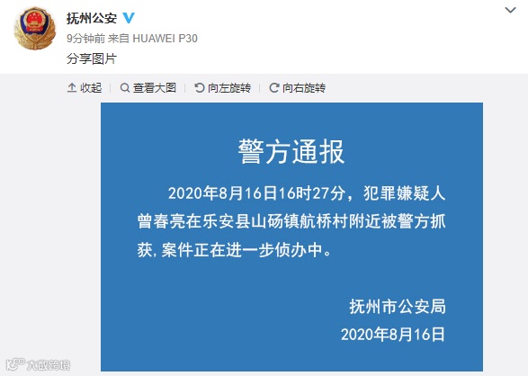 据江西抚州市公安局通报,2020年8月16日16时27分,犯罪嫌疑人曾春亮在乐安县山砀镇航桥村附近被警方抓获,案件正在进一步侦办中。