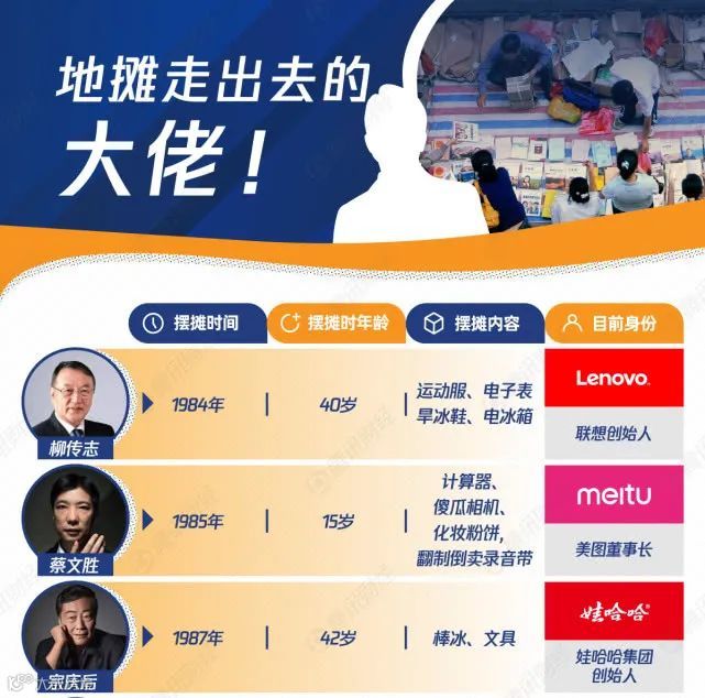 当年摆地摊的青年、中年,如今已经成为各行领军人物。如今的地摊热,或将诞生更多的未来领袖。