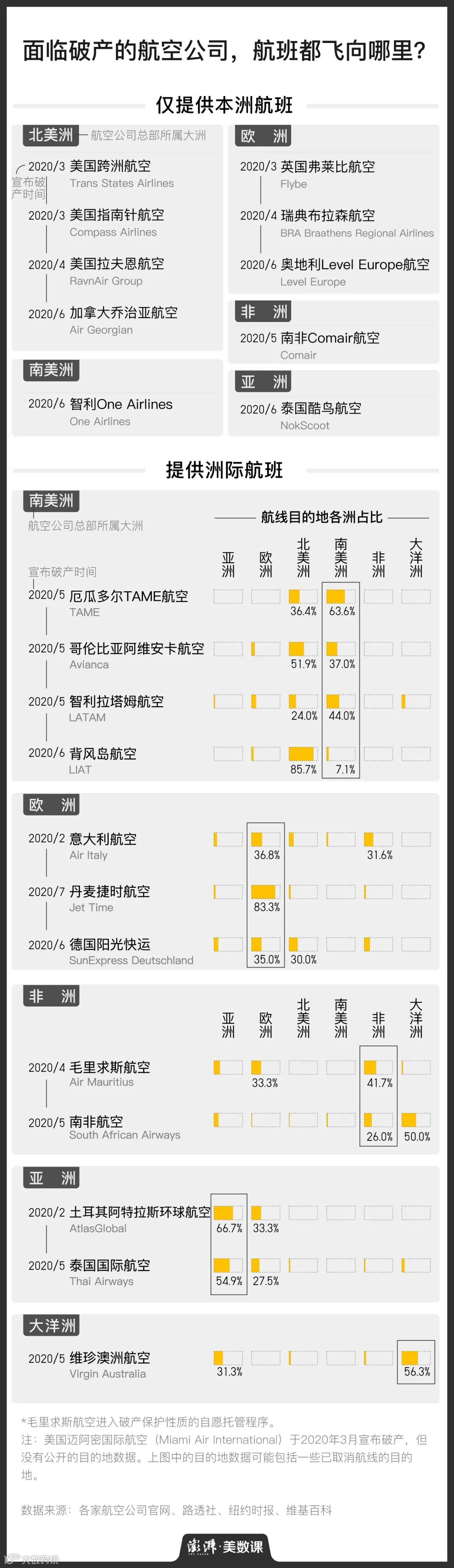 据公开媒体报道,疫情爆发后全球至少23家航司面临破产。 不仅美国跨州航空这类区域性航司受到影响,南非航空、维珍澳洲航空等 原本就负债累累的全球知名航司也在面临破产的名单中。在过去的这7个月里,无论哪条航线都躲不过疫情的阴影。