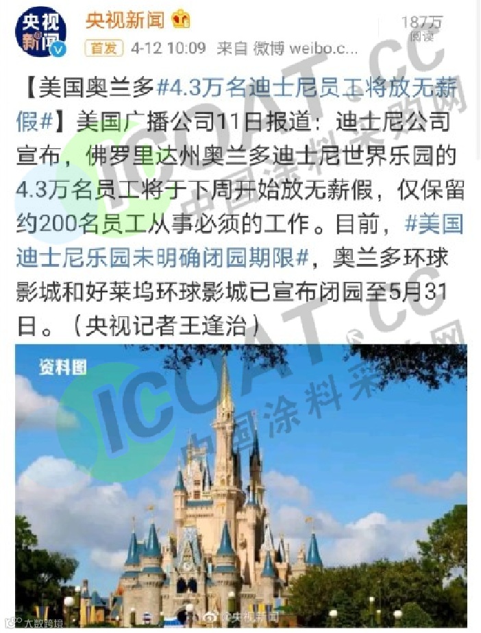 迪士尼将在本周停止支付10万名员工工资,以节省新冠肺炎期间的公司成本,此举每月将为迪士尼节省约5亿美元。此前,迪士尼美国员工已经开始无薪休假,仅佛罗里达州奥兰多迪士尼世界乐园一家,放无薪假的员工人数就达到4.3万人。