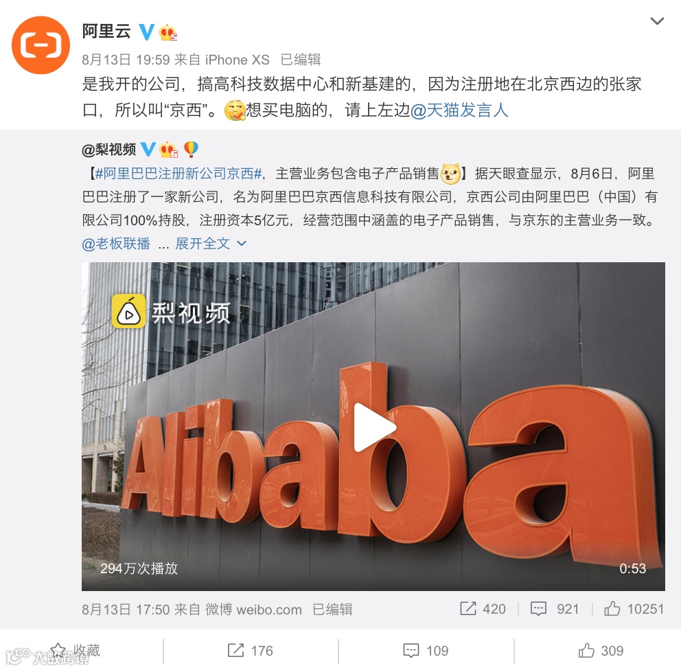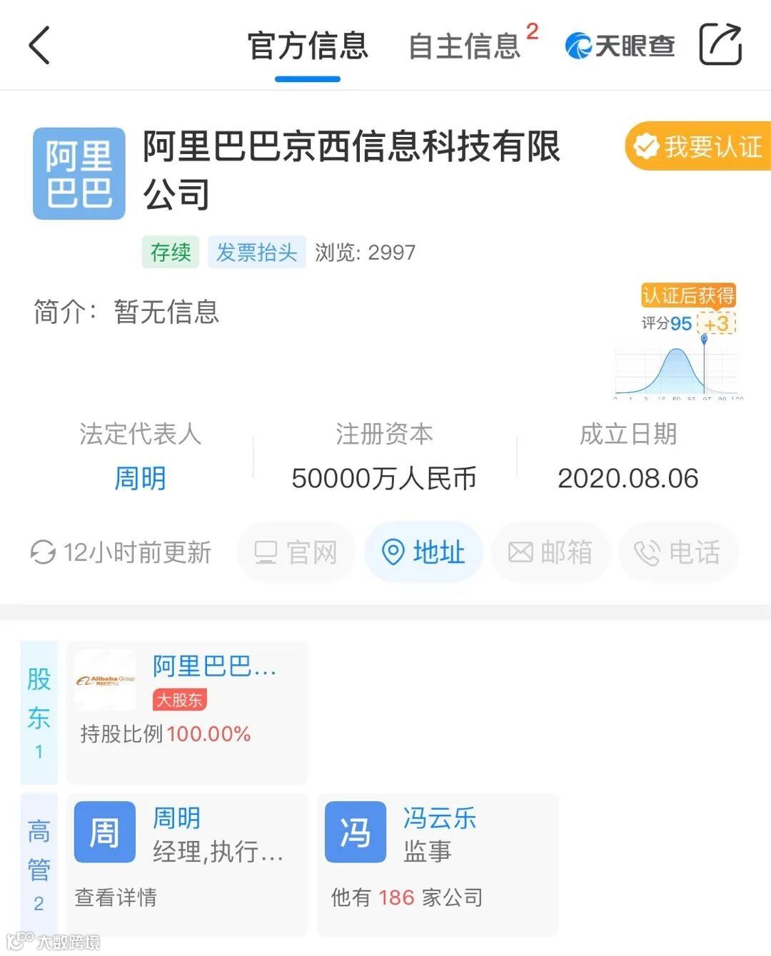 据悉,京西公司由阿里巴巴(中国)有限公司100%持股,注册资本 5 亿元人民币,法定代表人是周明,冯云乐任监事。其中,周明是阿里巴巴集团副总裁,负责基础设施事务。