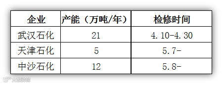 4月10日,武汉石化开始停车检修,检修产能为21万吨,检修时长为20天。五月初,天津石化及中沙石化也安排了检修计划,检修产能合为17万吨,这两家企业的检修时长还为确定。