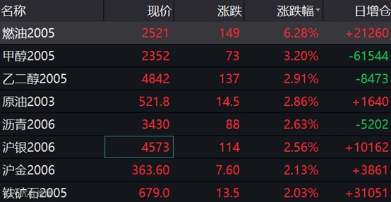 内盘期货市场,燃油主力合约一度涨7%,原油期货涨近3%,沪金涨逾2%。