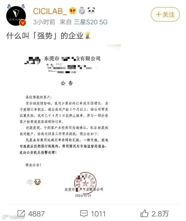 东莞一家熔喷布厂彻底被客户打款抢货逼疯!该企业4月14日公告,受全球疫情影响,公司口罩材料订单成百倍增长,订单积压超出产能2个月以上,给公司带来沉重负担,已于4月1日停止接单,并与一部分老客户协商退款取消部分订单。但客户仍私自转款,该企业忍不住发了公告:再给我打钱,我就要报警了!(看,又是别人家的企业)